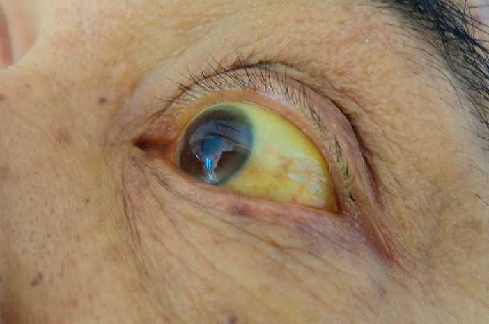 Kulit dan bagian putih mata terlihat menguning. Urine bisa berwarna gelap (seperti teh pekat) dan feses berwarna pucat (seperti dempul)